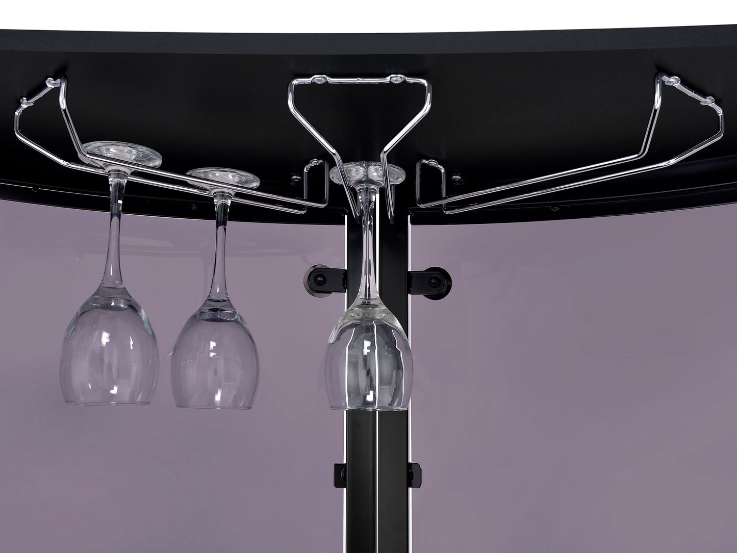 • Freestanding home bar with sleek black finish and curved frame silhouette
