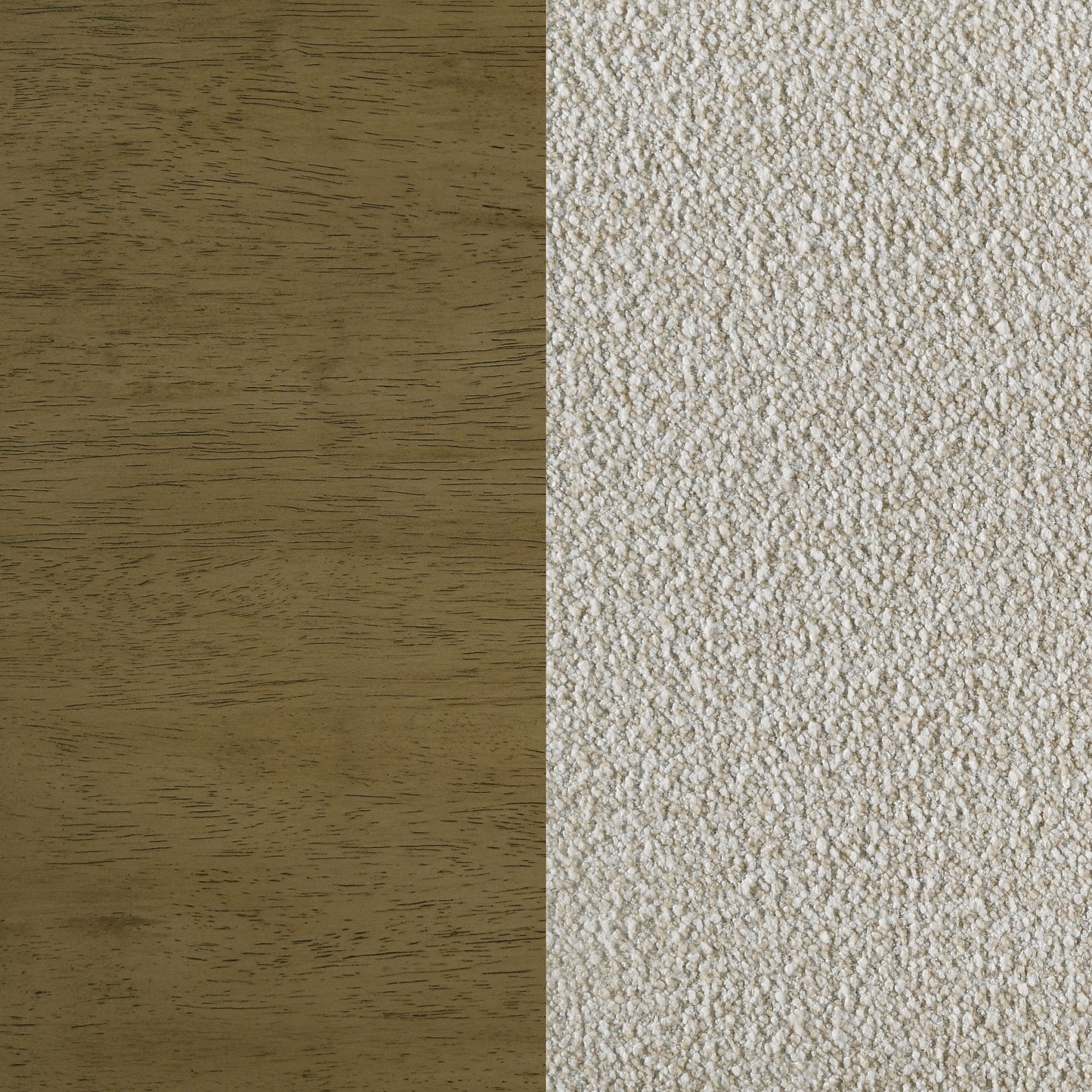 • Vertical channeled beige boucle upholstered headboard adds texture