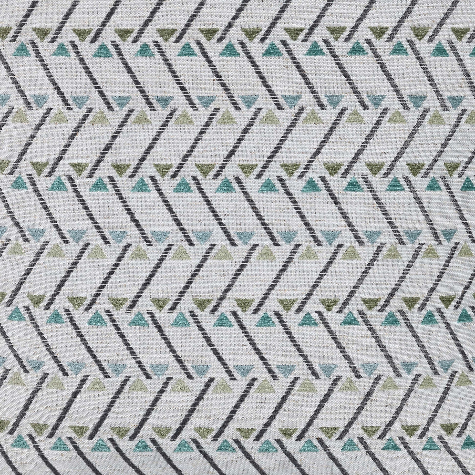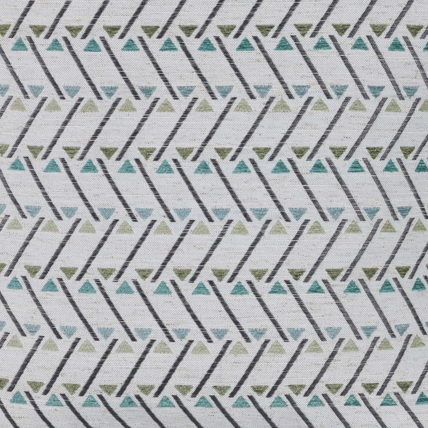 • Fabric upholstery features a multicolor geometric pattern in a gray-based palette