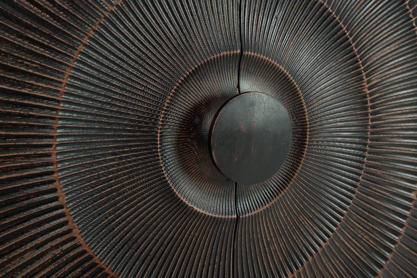 Details | Made with solid wood and engineered wood, Distressed black finish, Wood legs, Door fronts with carved pattern, Wood door pull, 2 doors, 2 shelves, Minor assembly required; simply lay flat and attach legs | |