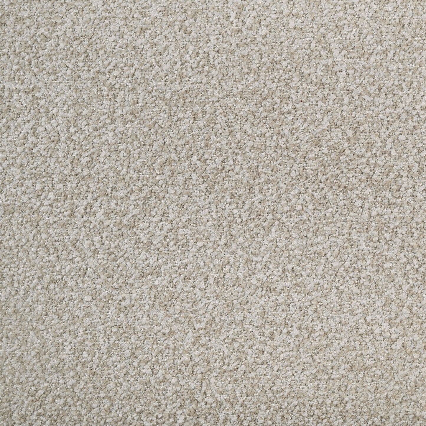 • Upholstered headboard in beige boucle provides soft texture and comfort