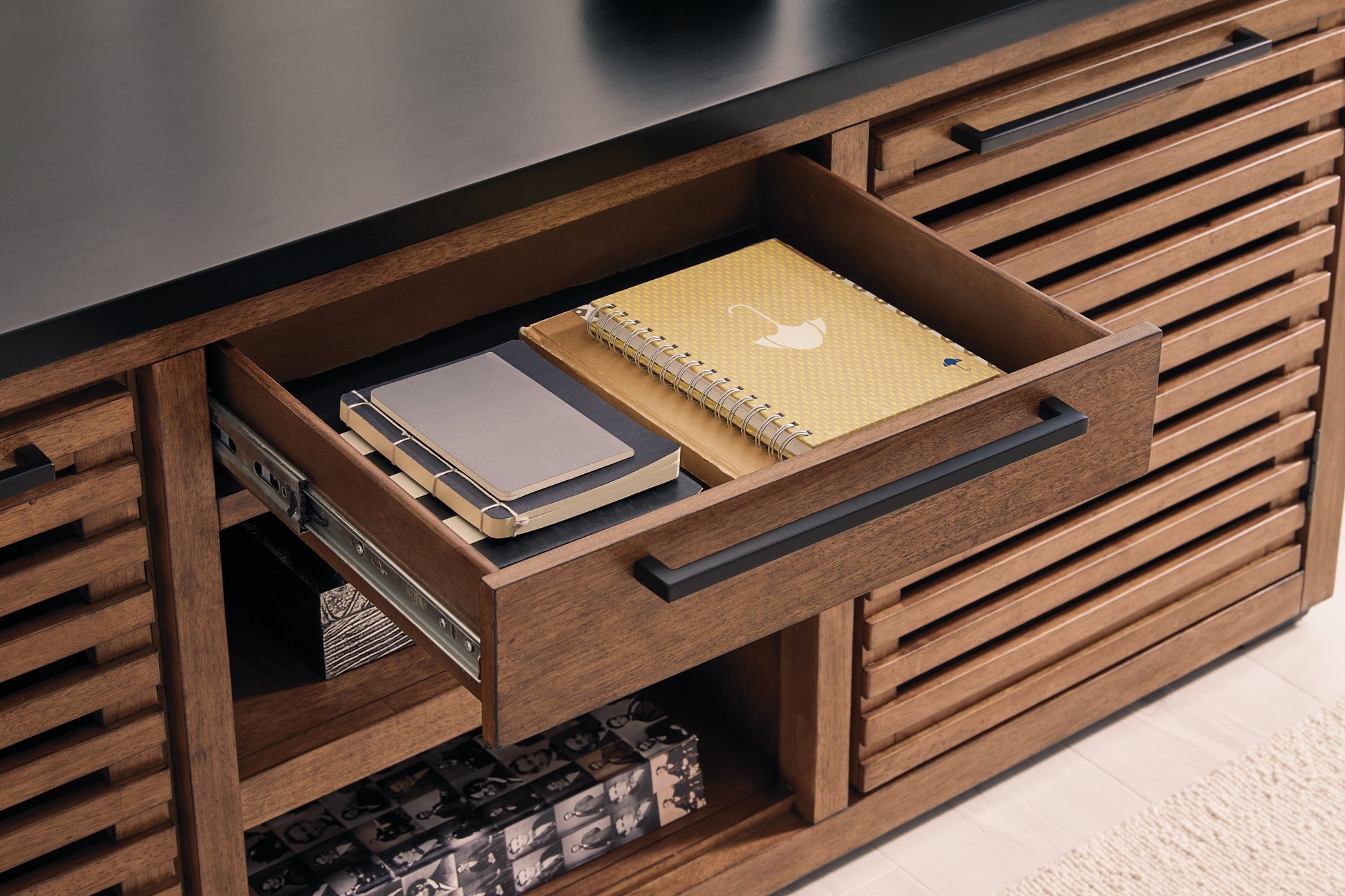 Details | Made with hardwood solids, mango wood veneer and MDF substrates, Two-tone finish (medium warm brown wood tone and matte black), Bar pulls with blackened steel finish, Smooth-gliding drawer, 2 cabinet doors, 2 adjustable shelves, Open storage area, Assembly required | |