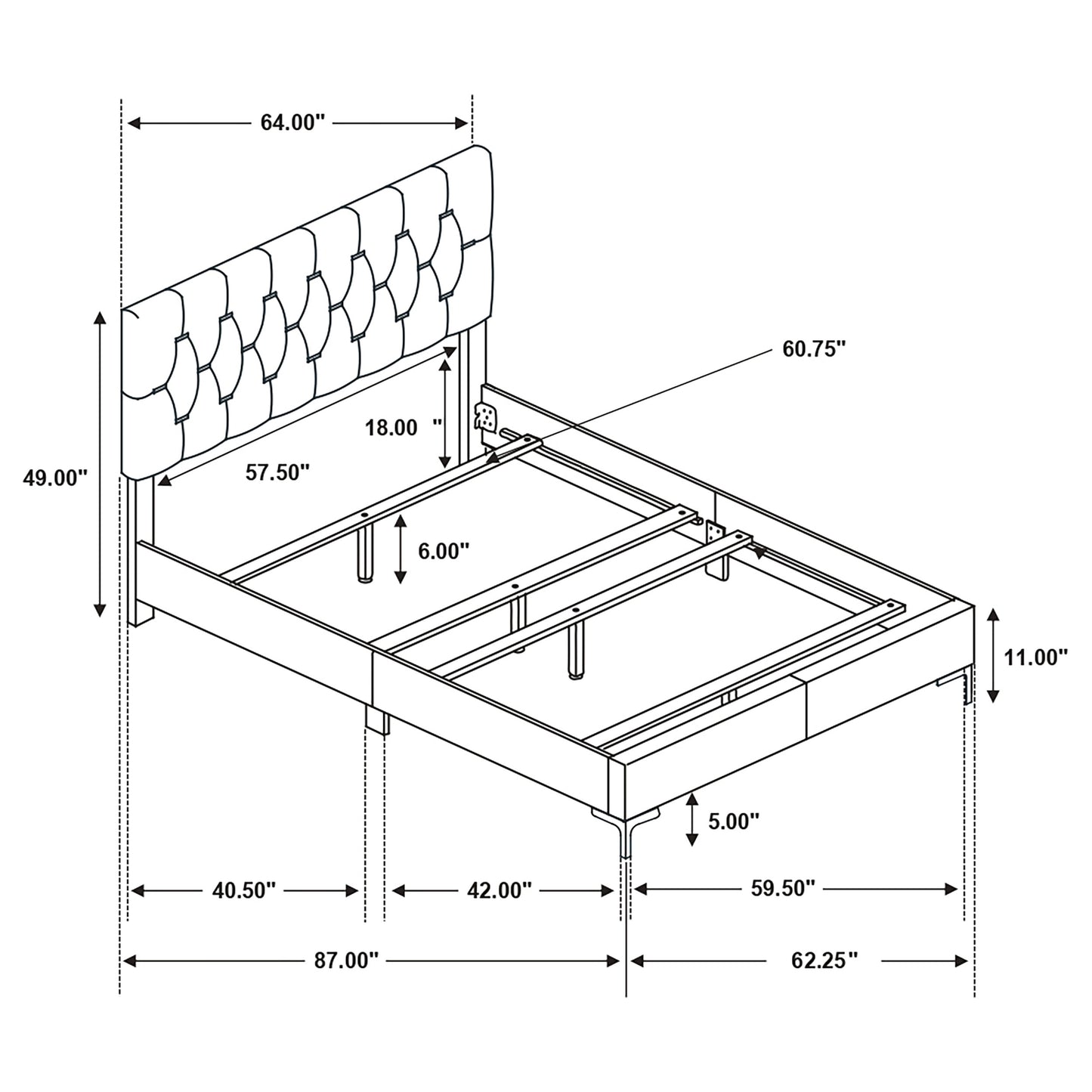 • Upholstered bed with a diamond tufted headboard offers a soft place to lean back and relax