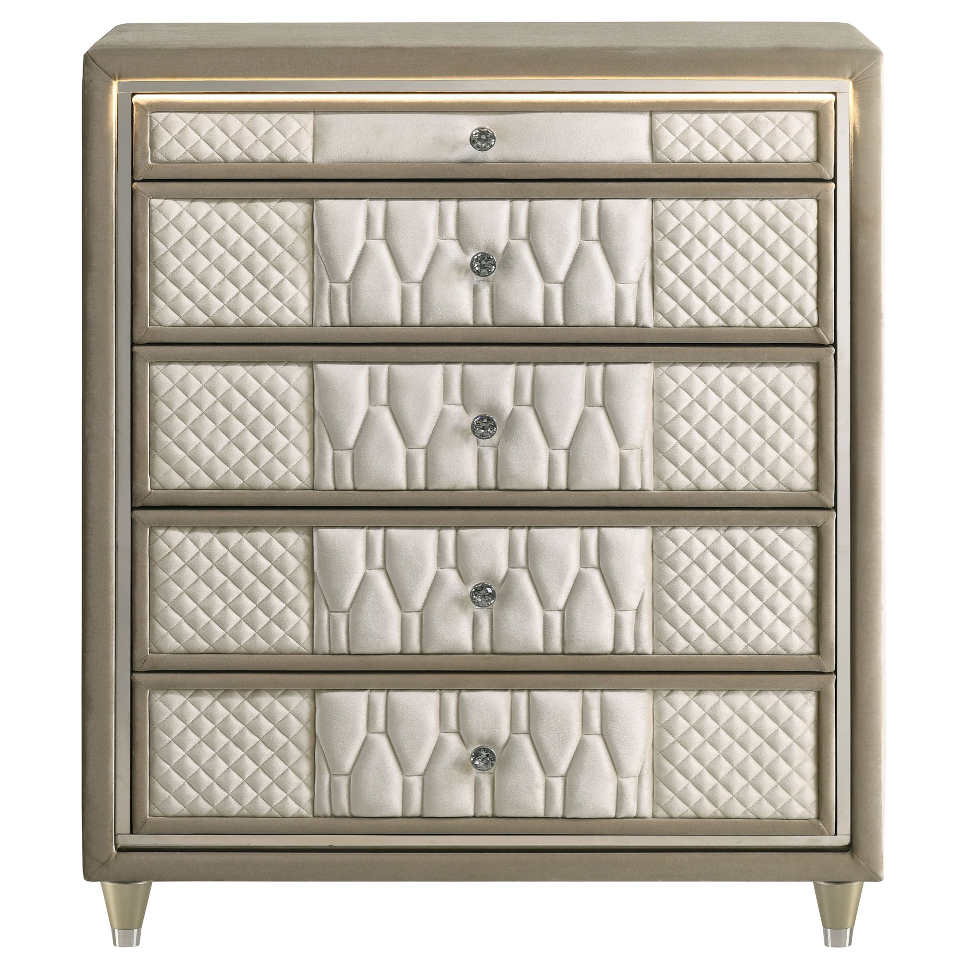 • Tempered glass top, crystal knobs, and quilted textures elevate the glam aesthetic