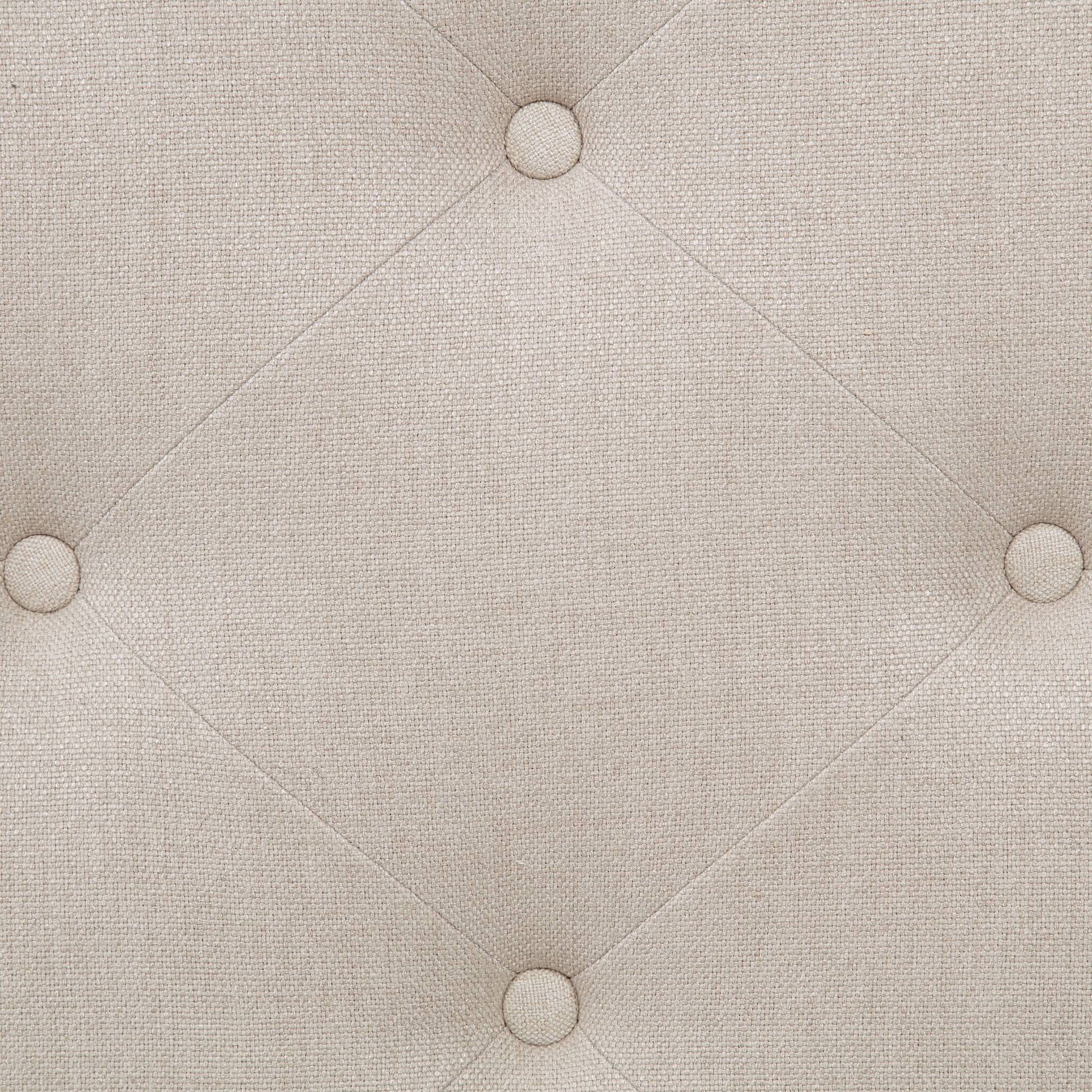 • Latte fabric upholstery with soft button tufting adds visual depth and texture