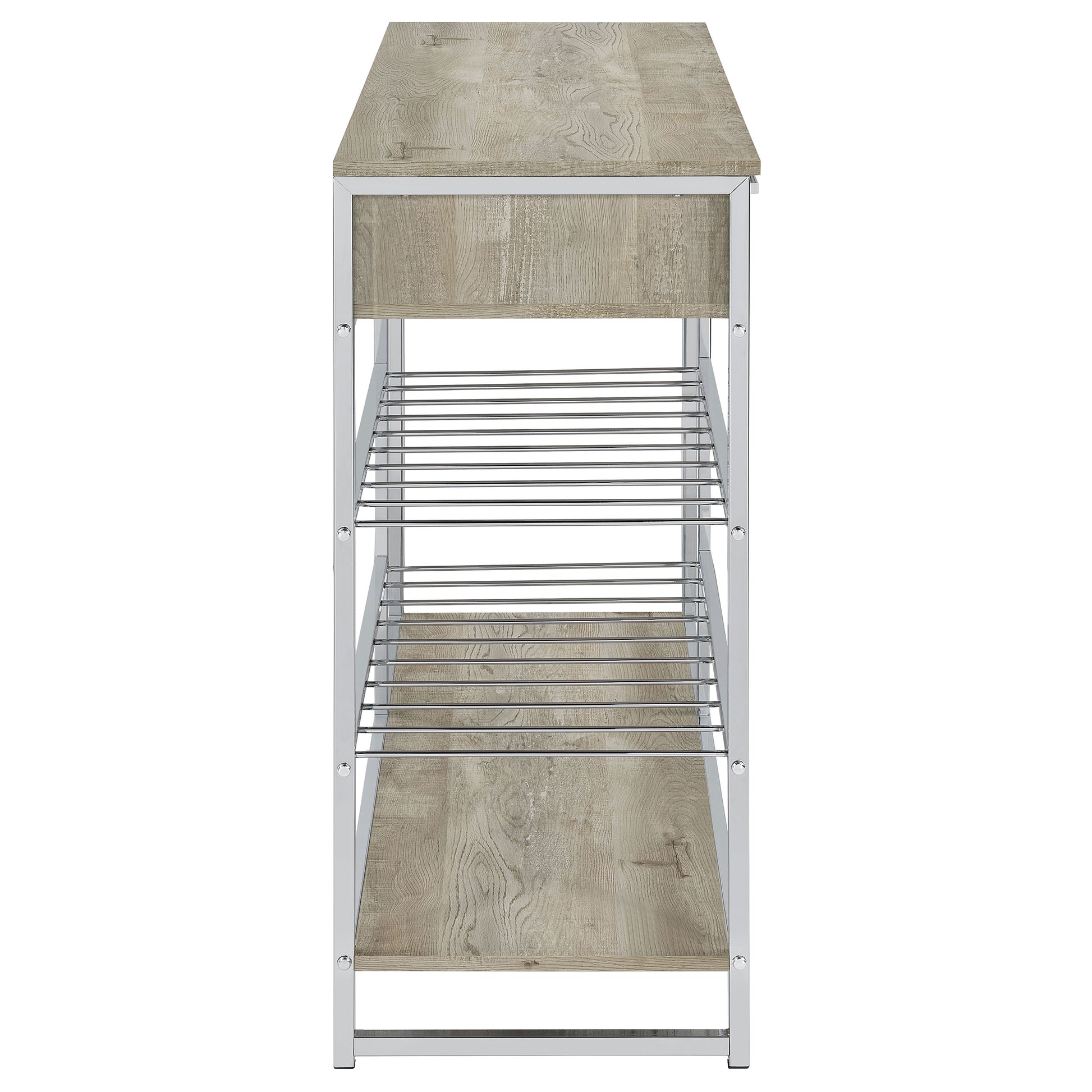 • Gray finish wood products construction with minimalist metal framing for an all-in-one wine cabinet with two drawers and two slat shelves