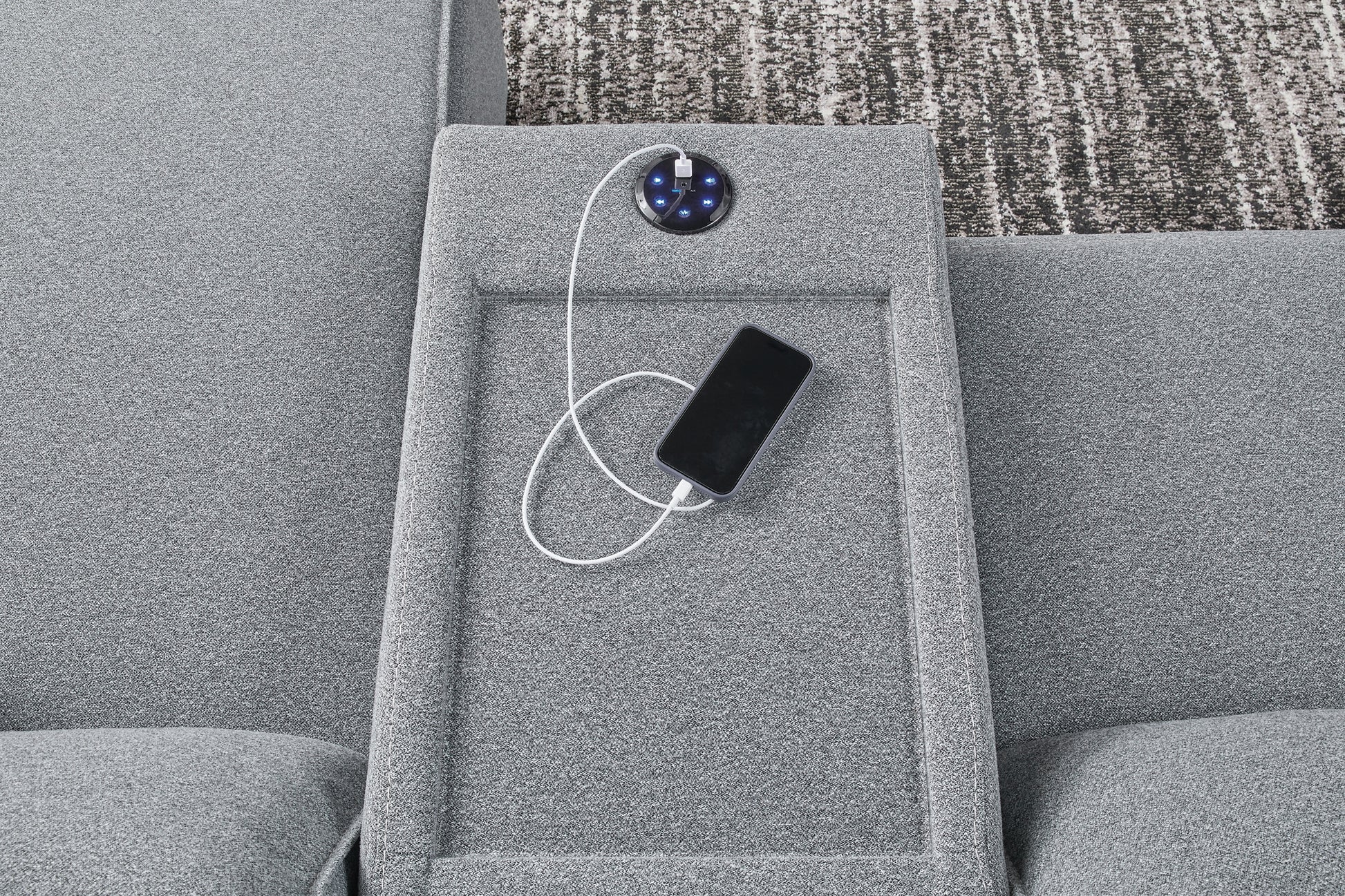 Details | Includes 6 modular pieces: left-arm facing power recliner, 2 armless chairs, console, wedge and right-arm facing power recliner, "Left-arm" and "right-arm" describe the position of the arm when you face the piece, Versatile modular pieces fit together in a variety of configurations, One-touch power control with adjustable positions, Easy View™ adjustable headrest and zero-draw USB port, Zero-draw technology only consumes power when the USB receptacle is in use, Corner-blocked frame with metal reinforced seat, Attached back and seat cushions; high-quality foam cushions wrapped in poly fiber, Polyester upholstery; Next-Gen Nuvella™ is a family-friendly fabric that is soft, easy to clean, stain-resistant and durable, Clean fabric with mild soap and water, let air dry; for stubborn stains, use a solution of 4 oz. bleach to 28 oz. water, Throw pillows with easy-to-remove zippered covers for machine washing; pillows with soft polyfill, Console with plexiglass top and 2 cup holders, Zero wall recliner design requires minimal space between wall and chair back, Power cord included; UL Listed | |