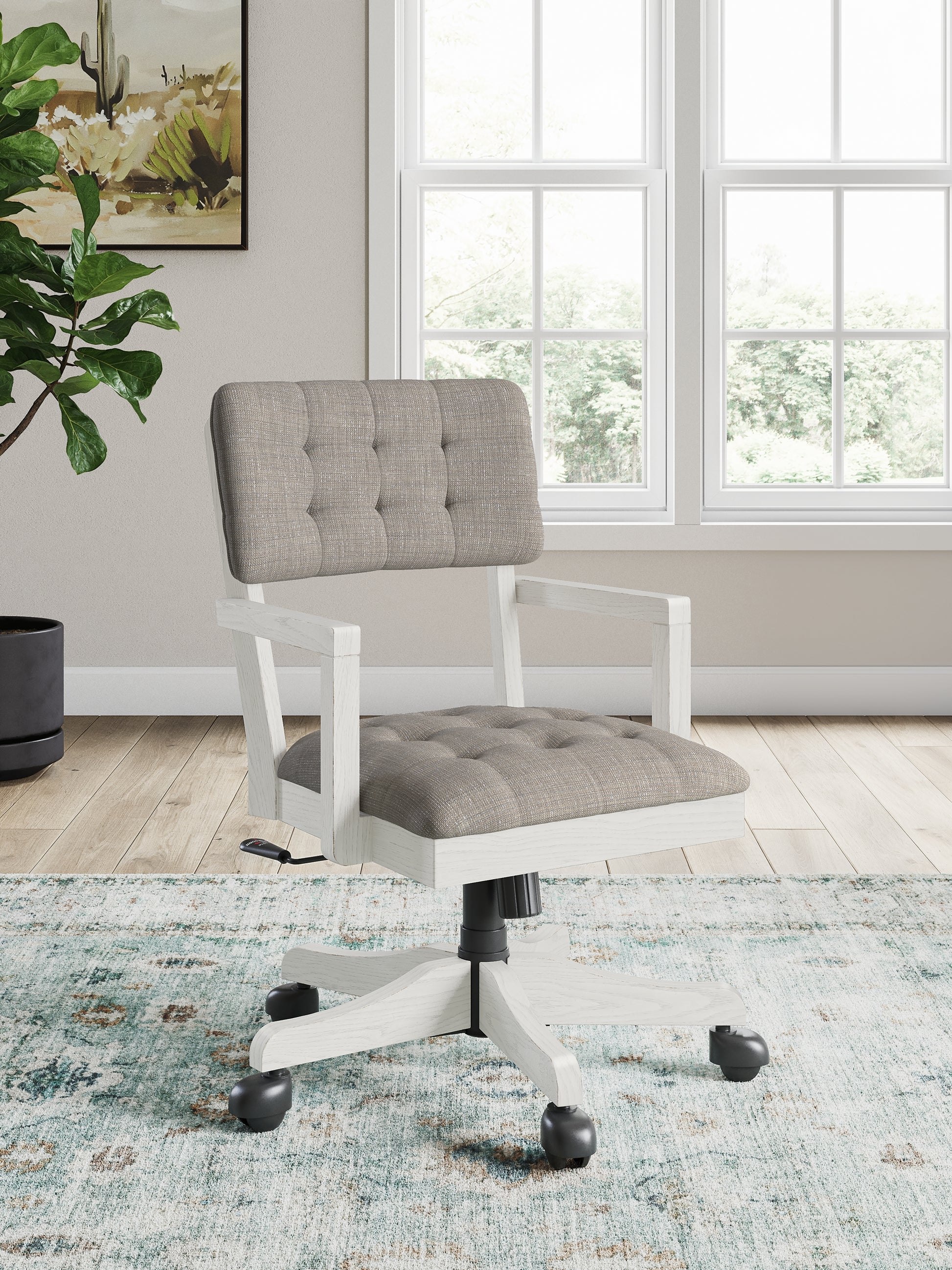 Details | Made with solid wood frame, Antiqued white finish with grain texture, Foam cushioned seat and backrest with polyester upholstery, Adjustable height, Casters for easy mobility, Assembly required | |